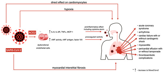 There are four potential ways in which cardiac muscle and cardiovascular injury may be explained in a novel coronavirus infection: First, a direct effect of the virus on cardiomyocytes; second, a hypoxia induced by respiratory tract infection; third, myocardial interstitial fibrosis; and fourth, acute infection and immune response of the organism including a cytokine storm which may alone trigger an acute myocardial infarction [63,64]. Electrolyte imbalance and the adverse effects of certain medications are other factors that may in addition force the heart muscle to work harder [64]. Nevertheless, possible disruption in coronary microcirculation with ischemic consequences remains putative, which was already suggested by Akhmerov et al. [63].
