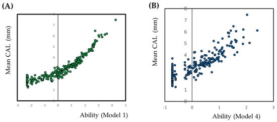 The models were evaluated using two methods: correlation between predictive values and observed values and ROC curve analysis. Ability calculated by IRT analysis indicates the predictive value of the sample. The scatter plot of the ability calculated using Model 4 against the mean values of CAL is illustrated in Figure 2. A scatter plot of all 168 examination sites (Model 1) is also presented as a reference. As the plot appears to be a curve, the generalized linear model was applied. The coefficient and intercept were statistically significant. The scatter plot of the result of the generalized linear model against the models for other clinical parameters is shown in Table S2.