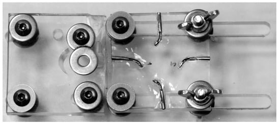 Static fatigue procedures were performed through the cyclic fatigue device previously described [,,] and based on the cyclic fatigue device developed by Plotino et al. []. The 16:1 reduction handpiece (X-Smart Plus, Dentsply Maillefer, Baillagues, Switzerland) was placed and fixed on a square polymethyl methacrylate structure using four fixations and the artificial root canals systems were placed in a square polymethyl methacrylate structure fixed by two fixations to the previous polymethyl methacrylate structure (Figure 1).