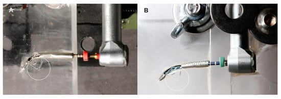 Two artificial root canal systems were constructed with 250 µm apical diameter, 60° curvature angle, 5 mm radius of curvature, 20 mm length, and 8% (25.08) (Figure 2A) and 6% taper (25.06) (Figure 2B). The artificial root canal systems were formed from a stainless-steel cylinder (Cocchiola S.A., Buenos Aires, Argentina) based on the anatomy of each NiTi endodontic rotary file to ensure an intimate contact between the artificial root canal system walls and the NiTi endodontic rotary files. The stainless-steel artificial root canal systems were partially removed to allow the identification of the exact time to failure of the tested endodontic rotary instruments (Figure 2A,B). Furthermore, all the static fatigue procedures were filmed to allow the measurement of the exact time to failure. The NiTi endodontic rotary files were placed inside the artificial root canal systems at their full working length before the static fatigue test started (Figure 2A,B).
