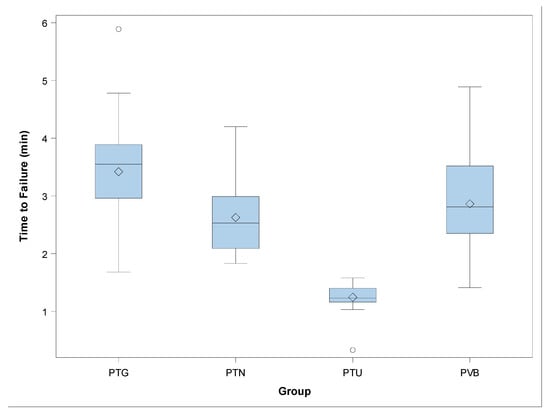 Box plot of the time to failure. The horizontal line in each box represents the respective median value of the study groups. ◊; Mean value of the box plots. PTU: ProTaper Universal; PTN: ProTaper Next; PTG: ProTaper Gold; PVB: ProFile Vortex Blue.