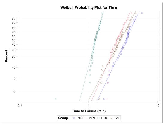 The mean and SD values for time to failure (minutes) for each of the study groups are displayed in Table 1 and Figure 3.