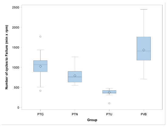 Box plot of the number of cycles to failure. The horizontal line in each box represents the respective median value of the study groups.○: Mean value of the box plots.