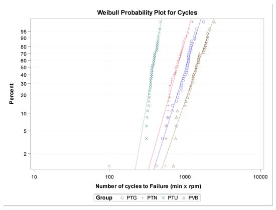 Weibull probability plot of the number of cycles to failure for the study groups.