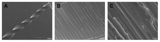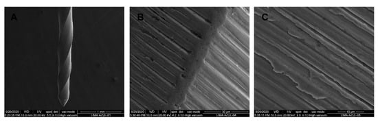 SEM analysis of the CM-Blue Wire alloy PVB endodontic rotary files did not show accumulation of organic matter or structural alterations. Furthermore, manufacturing lines were distributed perpendicularly to the longitudinal axis of the endodontic rotary files and also parallel to each other due to the laser machining manufacturing process (Figure 13A–C).
