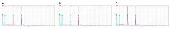 EDX micro-analysis of NiTi alloy PTU endodontic rotary files in location (A) 1, (B) 2, and (C) 3.