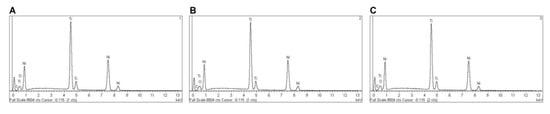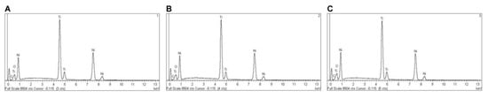 EDX micro-analysis of CM-Gold Wire PTG endodontic rotary files in location (A) 1, (B) 2, and (C) 3.