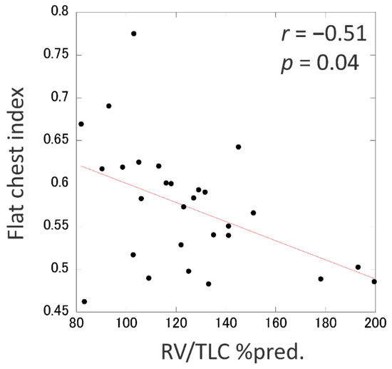Nine of the 37 IPPFE patients did not have any RV/TLC data because of severe respiratory dysfunction (n = 4) or simply because the lung capacities were not examined (n = 5). To overcome the concern that these patients had no opportunity to meet the physiological criteria, we focused on the flat chest index as an alternative physiologic parameter to the RV/TLC %pred. The flat chest index was inversely and significantly correlated with the RV/TLC %pred. (r, −0.51; p = 0.04) (Figure 4). Using a simple linear regression model, the cut-off values of RV/TLC %pred. of 80 and 115 were found to correspond to flat chest indices of 0.62 and 0.58, respectively.