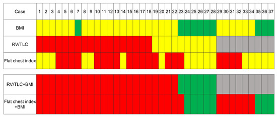 The diagnosis using a combination of the flat chest index and BMI, i.e., (a) flat chest index ≤ 0.58 or (b) >0.58 flat chest index but ≤0.62 and BMI ≤ 20, was highly concordant with the diagnosis according to the combination of the RV/TLC %pred. and BMI (kappa coefficient, 0.88) (Figure 5, case 1–28). In the present study, the diagnostic sensitivity and specificity of a combination of the flat chest index and BMI were equivalent to those obtained with the physiologic criteria (Table 2) (sensitivity of 82.1% vs. 78.6% and specificity of 89.3% vs. 88.0%, respectively). While IPPFE patients who did not have RV/TLC %pred. data could not be assessed for whether or not they met the physiological criteria, 66.7% (6/9) of them met the alternative criteria using the combination of the BMI and flat chest index (Figure 5, case 29–37).