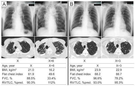 Representative IPPFE patients who did not meet the physiologic criteria at the time of the diagnosis. (A) A 68-year-old man who came to meet the physiological criteria during the clinical course. Although the forced vital capacity (FVC) was relatively well preserved at the time of the diagnosis, he experienced a marked decline in the FVC over the six years from the diagnosis, accompanied by decreases in the body mass index (BMI) and flat chest index and an increase in the percentage of the predicted values of residual volume/total lung capacity (RV/TLC %pred.). (B) A 68-year-old man who did not meet the physiological criteria during the observation period. The FVC was relatively well preserved at the time of the diagnosis as well as three years after the diagnosis. The BMI, flat chest index, and RV/TLC %pred. did not change markedly during the three years.