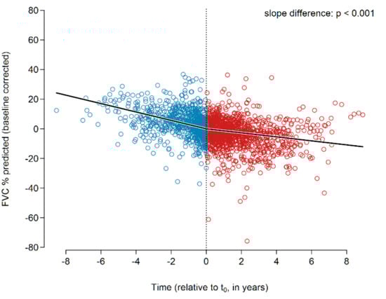 After setting baseline and performing individual FVC slope analysis individually as detailed above, all FVC data were corrected for the baseline values and analyzed together employing a global segmented regression, hereby disregarding the statistical dependencies of the patients’ recordings. In this analysis, the slopes and slope change were determined in a single segmented regression model using all data of all 122 patients and 2040 FVC values together (Figure 1). The slopes before and after t0 were −2.84 and −1.36% predicted p.a. (p < 0.001), respectively. The slope change at t0 was found to be +1.48 ± 0.28 (p < 0.001). Our results hence show a reduction in the annual FVC decline of roughly 50% under treatment with pirfenidone.