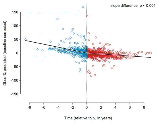Although the individual slope analysis did not reveal any significant treatment effects, the global analysis revealed a significantly reduced DLco decline under pirfenidone. The slopes before and after t0 were −5.35 and −1.83% predicted p.a. (p < 0.001), respectively. The slope change at t0 was found to be +3.51 ± 0.63 (p < 0.001). Figure 2 presents the data.