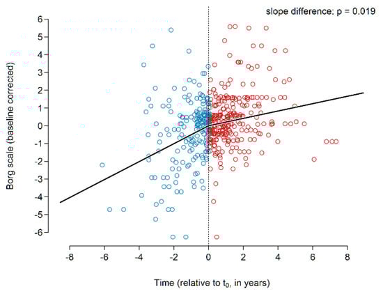 5.2.4. Change in Individual Slope Prior to and after t0 of DLco (% pred.), Borg Scale (Dyspnea Grade 1–6), and 6MWD (m)
