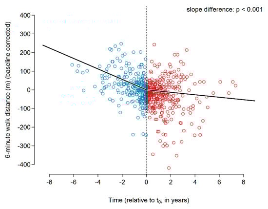 The global slope analysis showed a decline of 28 m per year in the 6MWD prior to the initiation of treatment (Figure 4). Upon initiation of pirfenidone treatment, the decline in 6MWD was found to be reduced, resulting in a slope of −6.6 m/year. This slope change was highly significant (p < 0.001).