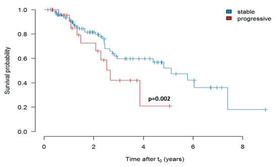 Survival of pirfenidone-treated patients with “stable” (FVC decline less than 10% p.a.) versus “progressive” (FVC decline more than 10% p.a.) disease prior to initiation of therapy (Kaplan-Meier curve shows estimate values). In this analysis the FVC slope was used as continuous predictor in a Cox proportional hazards (PH) model.