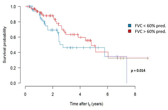 When analyzing the impact of FVC at the timepoint of treatment initiation, we did observe a weak, albeit significant (p = 0.014) impact of an FVC more than 60% versus less than 60% predicted on survival. The results are shown in Figure 6.