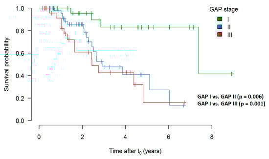 Survival depending on GAP stage at t0 (Kaplan–Meier curve shows estimate values). Abbreviations: GAP—Gender, Age, Physiology.
