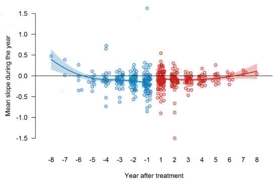 Therapy response to pirfenidone as measured by differences in the FVC slopes before and after t0. Figure 8 shows the values of FVC (in liters), blue dots represent values before t0, red dots—values after t0 (start of therapy). In addition, the points for the annual changes in the years before t0 are now also drawn. The year “0” is missing on the x-axis, the year “−1” is the change from year −1 to year 0 (=t0) (i.e., the period of the first year before t0), and the year “1” is the change from year 0 to year 1 (i.e., the period of the first year after t0).