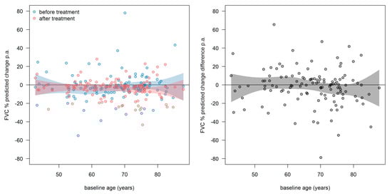 Additionally, we showed the distribution of the FVC slope and slope differences in dependency of age at t0 (Figure 9). The treatment response to pirfenidone did not depend on age at t0.