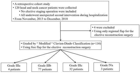 This retrospective cohort study was approved by the Institutional Review Board of China Medical University Hospital (No. CMUH108-REC1-021). From November 2013 to December 2018, data were collected from 120 patients with head and neck cancer who had undergone an unplanned second operation after free flap reconstruction during hospitalization at China Medical University Hospital. After a complete review of the electronic medical charts of each patient, four patients were excluded because regional flaps were used rather than free flaps in these patients. Therefore, 116 patients with head and neck cancer, who were treated by a team of five microsurgeons, were enrolled (Figure 1).