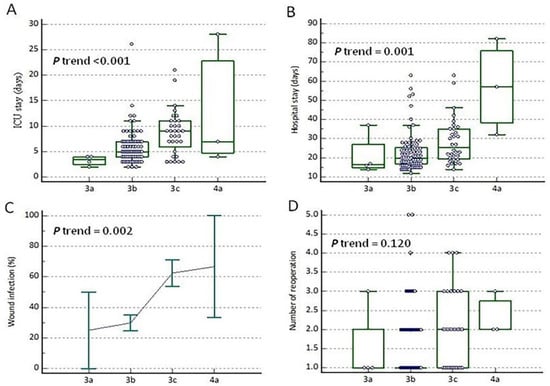A rising trend was observed in the duration of ICU stay (p < 0.001), duration of hospital stay (p = 0.001), and wound infection rate (p = 0.002) from grade IIIa to grade IVa, which represents a correlation between the severity grading levels of postoperative complications and patient outcomes (Figure 2A–C). The number of reoperations during the current hospitalization within the newly modified classification also increased in the Box–Whisker plot picture (Figure 2D).