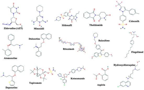 Chemical structures of the drugs that are efficacious examples of drug repurposing approach and are approved by the FDA for their multiple applications. The chemical structures are adapted from (pubchem.ncbi.nlm.nih.gov/).