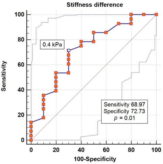 ROC curve analysis for Δ liver stiffness showed an area under the ROC curve = 0.726, sensitivity 71.4%, specificity 70%, positive predictive values 81.5 and negative 45.5, p = 0.02 with Youden Index J = 0.41 (Figure 1).