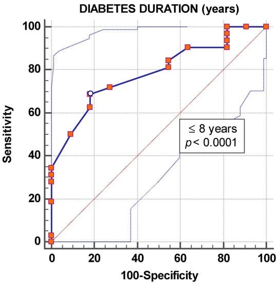 A diabetes duration ≤ 8 years represents a statistically significant predictive factor for DD1 remission, with a sensitivity of 68.7% and specificity of 81.8%, according to the ROC curve (area under the curve 0.788, 91.6 positive predictive values, and 47.3 negative predictive values, p < 0.0001), as illustrated in Figure 2.