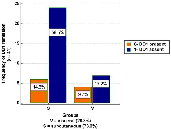 To analyze whether the predominant type of adipose tissue is a risk factor for the DD1 remission following one-year treatment with dapagliflozin, we used the following codes: patients with a subcutaneous/visceral fat ratio greater than 1 were coded with 0, and the others with 1; the patients with remitted DD1 were coded with 1, and the others with 0. Figure 3 illustrates the frequency of DD1 remission stratified by the predominant type of adipose tissue.