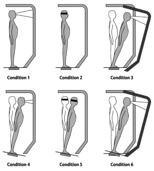 The SOT assesses the ability of participants to process individual sensory input to maintain balance control under the combined conditions of eye-opening status, the sway of footplate, or movement of visual surrounds. Participants were tested under six sensory conditions (three 20 s trials each), where surface and visual surroundings were systematically modified: (1) eyes-open with fixed footplate and visual surround, (2) eyes-closed with fixed footplate and visual surround, (3) eyes-open with fixed footplate and moving visual surround, (4) eyes-open with sway of the footplate and fixed visual surround, (5) eyes-closed with sway of the footplate and fixed visual surround, (6) eyes-open with sway of the footplate and visual surround (Figure 1). An equilibrium composite score was calculated by comparing the angular difference between a participant’s maximum anterior to the posterior center of gravity displacement and the maximum possible sway range of 12.5°. A score of 0 indicates a fall, whereas a score of 100 means no sway. A strategy score presents the degree of use of ankle strategy compared to the hip strategy for maintaining balance.