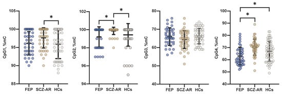The levels of cortisol were significantly higher in patients with psychotic disorders compared to controls. There were no significant between-group differences between the whole group of patients and healthy controls in the levels of FKBP5 methylation (Table 1). However, further stratification of the sample revealed the following significant differences (post-hoc tests): (1) higher CpG1 methylation in SCZ-AR patients compared to healthy controls (p = 0.026); (2) higher CpG2 methylation in SCZ-AR patients compared to FEP patients (p = 0.002) and healthy controls (p = 0.042) and (3) lower CpG4 methylation in FEP patients compared to SCZ-AR patients (p < 0.001) and healthy controls (p = 0.033) (Figure 2).