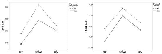 Bivariate correlations between the FKBP5 methylation levels and potential confounding factors were presented in Table A1. Based on this analysis, the following factors were associated with the FKBP5 methylation: (1) BMI for CpG1; (2) age, sex and cortisol levels for CpG2; (3) sex, cigarette smoking status, BMI and cortisol levels for CpG3 and (4) sex, BMI and CPZeq for CpG4. These variables were included as covariates in the ANCOVA (Table 2). There were significant main effects of diagnostic group (FEP vs. SCZ-AR vs. healthy controls) on the level of CpG4 methylation in the models testing all categories of adverse childhood experiences. These effects were not significant in the models that included methylation of CpG1, CpG2 and CpG3 as dependent variables. There were also significant main effects of parental antipathy and sexual abuse on the level of CpG4 methylation. More specifically, parental antipathy and sexual abuse were related to lower CpG4 methylation in all participants (Figure 3). Regarding covariates, significant main effects of sex were found in all models that included the levels of CpG3 and CpG4 methylation. In turn, BMI was associated with the level of CpG4 methylation in the majority of ANCOVA models, except for the one that included a history of parental neglect.