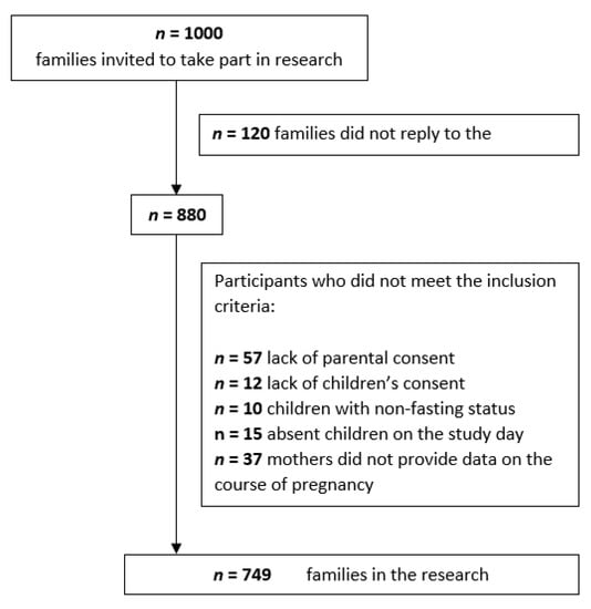 Finally, the study involved 749 mothers and children. The detailed procedure for determining the participants is presented in Figure 1. After consent was obtained, it turned out that the age range of the subjects was within the range of 4–15 years. The children attended kindergartens, primary and junior high schools. The mean age of the examined children was 9.36 years ± 3.52 years.