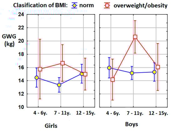 Our detailed analysis showed that, in the group of 7–11-year-old boys, statistically significant differences were found between boys with normal weight and boys with overweightness and obesity. Mothers of boys with excessive body weights gained, in pregnancy, an average of 5.5 kg more than the mothers of boys with a normal body weight. In the case of the entire age group of 7–11-year-olds, an analogous difference of 4.5 kg was demonstrated. The latter data were partially consistent with the results of the extensive meta-analysis by Voerman et al. The authors showed that a higher maternal pre-pregnancy BMI and gestational weight gain were associated with an increased risk of childhood overweight/obesity, with the strongest effects at later ages [52].