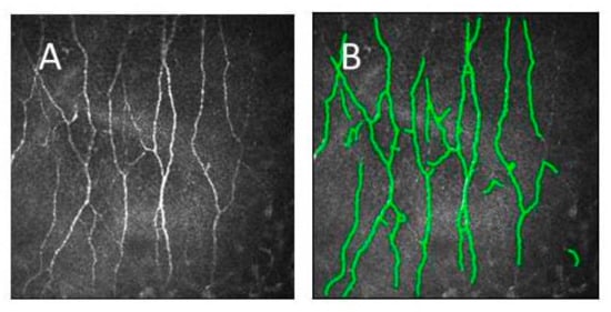Image processing and quantitative image analysis were performed by the reading center using Mathematica (Version 11.3, Wolfram Research Inc., Champaign, IL, USA), as previously described []. The following SNP parameters were calculated: corneal nerve fiber length (CNFL), defined as the total length of all nerve fibers per unit area (mm/mm2); corneal nerve fiber density (CNFD), defined as the number of nerve fibers per unit area (n/mm2); corneal nerve branch density (CNBD), defined as the number of branching points per unit area (n/mm2); average weighted corneal nerve fiber tortuosity (CNFTo), reflected variability of nerve fiber directions and defined as absolute nerve fiber curvature/nerve fiber length (μm−1); corneal nerve connection points (CNCP), defined as the number of nerve fibers crossing the area boundary (connections/mm2); average corneal nerve single-fiber length (CNSFL), defined as the average length of nerve fibers (μm); and average weighted corneal nerve fiber thickness (CNFTh), measured as mean thickness perpendicular to the nerve fiber course (μm).