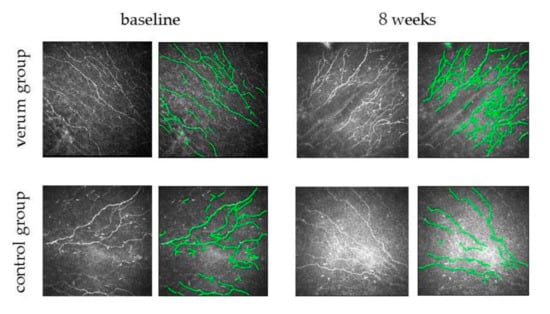 Due to the heterogeneous, multicausal nature of DED, particularly in patients suffering from severe, chronic DED, a personalized clinical management resulting in an individualized optimum therapy is required []. Only patients under stable therapy had been included in the HYLAN M study, and their optimum individual therapy served as a control in comparison to patients in which 0.15% HMWHA eye drops were tested. The assessment of the subbasal corneal nerve plexus was an optional test in addition to the standard diagnostic test battery of the study. Four out of 11 study centers provided CSLM images from 16 per-protocol patients, eight each in the Comfort Shield group and in the control group. The SNP is usually not well structured in severe dry eye disease []. Due to the small number of patients, only the results of CNFL showed a significant difference between the two study arms. This is in accordance with other studies reporting that CNFL is the most reproducible parameter in the evaluation of IVCM images of the subbasal nerve plexus [,,,,,,,].