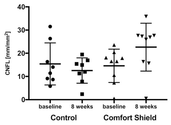 CNFL of the Comfort Shield group and the control group at baseline and eight weeks.