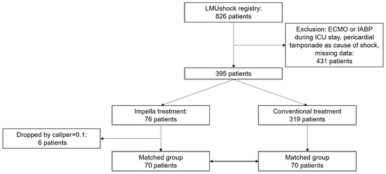 Registry data of 826 patients with cardiogenic shock treated in two cardiologic ICUs between 2010 and 2020 were available. After exclusion of patients according to exclusion criteria, 76 patients with Impella support were considered eligible for matching (Study Flow chart, Figure 1). Due to six missing matching partners when using a caliper of 0.1 for matching, 70 patients with Impella support were matched with 70 patients without mechanical circulatory support as described above, achieving a standard difference of mean below 0.1 for all matching parameters (Supplementary Figure S1).