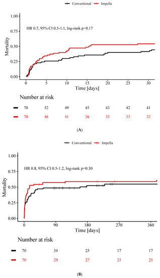 At presentation, the mean age was 67 ± 15 years with 80% being male in the group without support and 67 ± 14 years (p = 0.97) with 76% being male (p = 0.68) in the group with Impella. Cardiovascular diseases and cardiovascular risk factors before onset of cardiogenic shock were distributed evenly. There was no significant difference in the rate of cardiac arrest (47% vs. 51%, p = 0.73), duration of cardio-pulmonary resuscitation if applicable [minutes] (median 24.0, interquartile range (IQR) (9.5,52.5) vs. 19.0 (1.0,26.5), p = 0.22). Myocardial infarction was the predominant cause of cardiogenic shock in both groups (70% vs. 77%). The baseline characteristics of both groups are displayed in Table 1. Patients’ characteristics before matching are shown in Supplementary Table S1.