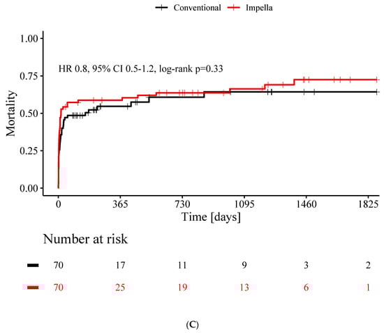 A total of 41% of patients without cardiocirculatory support and 54% of patients with Impella support died during the first month (p = 0.17) (Figure 2A). After one year, mortality rates were similar in both groups (55% in conventional vs. 59% in Impella CP group, p = 0.30) (Figure 2B) as was mortality rate at long-term 5-years follow-up (64% in conventional vs. 73% in Impella CP group, p = 0.33) (Figure 2C).