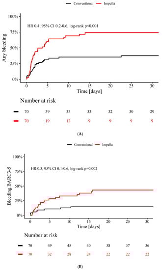 The rate of any bleeding event during ICU stay (37% vs. 74%, p < 0.001) (Figure 3A) as well as the rate of clinically significant bleedings classified as BARC 3 or higher was lower in the conventional group than in Impella CP group (15% vs. 43%, p = 0.002) (Figure 3B). There were no vascular complications in the control group whereas 7% of the patients in the Impella group (p = 0.07) suffered from vascular complications.