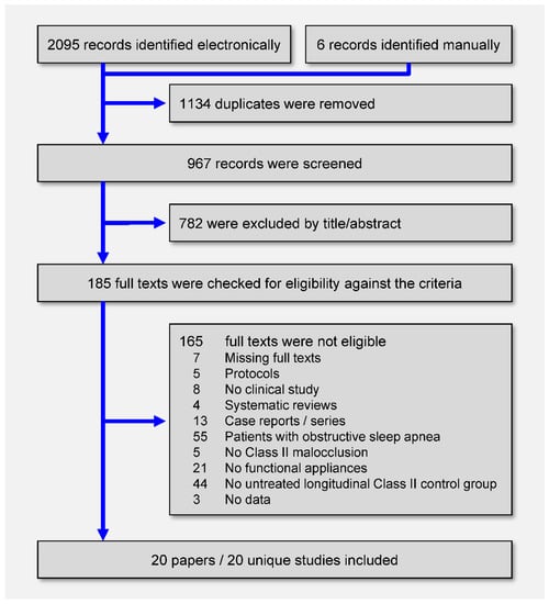 Based on the Participants-Intervention-Comparison-Outcome-Study design (PICOS) schema and as few randomized trials exist on this matter, included were randomized and nonrandomized clinical studies on systemically healthy growing human patients of any age (<18 years), sex, and ethnicity with Class II malocclusion with mandibular retrognathism receiving orthopedic functional appliance treatment without any limitations on language, publication year, or status. Excluded were nonclinical studies, animal studies, and case reports/series, as well as studies with obstructive sleep apnea patients, studies without functional appliance treatment, and studies without an untreated longitudinal Class II control group. The primary outcome for this review was the total volume of the upper airways or any specific airway compartment assessed with Cone Beam Computerized Tomography (CBCT). Secondary outcomes included other measures of airway dimensions in terms of linear distances or areas, measured either on lateral cephalograms or CBCTs and in either upright or supine position.