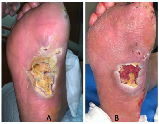 DFU healing. (A) Wound at baseline (T0) and (B) after 30 days of treatment.