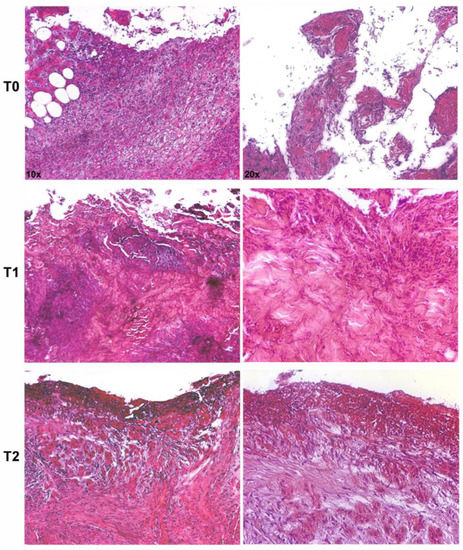 Representative microphotographs of hematoxylin–eosin-stained paraffin sections of skin biopsies show progressive healing of an infected ulcer treated with silver sulfadiazine (SSD). The pretreatment biopsy (T0) presented an intense inflammatory infiltrate in the dermis and evident clusters of microbial agents along the epithelial borderline. After 7 (T1) and 30 days (T2) of treatment, a significant reduction of the inflammatory infiltrate and microbial agents were observed, with the deposition of new collagen (magnification: 10× and 20×).