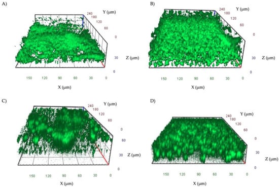 A total of 16 strains, including eight S. aureus and eight P. aeruginosa, isolated from patients with DFUs, were analyzed. All the isolates were found to be strong biofilm-producers by the cBRT. Confocal microscopy analysis of the biofilms (Figure 3) was performed after 48 h of incubation to develop a mature biofilm. S. aureus isolates (Figure 3A,B) formed a uniform layer of biofilm of 25–40 μm. P. aeruginosa isolates (Figure 3C,D) formed either pronounced mushroom-shaped structures of 40–60 μm or a uniform layer of cells of 25–40 μm.