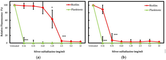 Planktonic cells of S. aureus and P. aeruginosa isolates exhibited a significant (p < 0.001) decrease in cell viability at 0.16 mg/mL of SSD when compared to the untreated controls. The viability of S. aureus in biofilm was significantly (p = 0.01) reduced by 36.8% in the presence of 1.25 mg/mL of SSD and experienced a severe (p < 0.001) reduction of 94.7% when exposed to a concentration of 2.5 mg/mL (Figure 4a). Notably, the resazurin assay showed that the viability of P. aeruginosa isolates was significantly (p < 0.001) reduced by 92.6% when biofilms were exposed to a concentration of 0.31 mg/mL of SSD (Figure 4b).