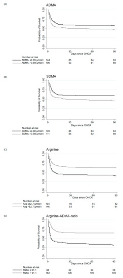 Third, previous research has shown several routine blood markers from different clinical pathways to be helpful in prognostication of outcome for OHCA patients [27,50]. Especially levels of inflammation and shock correlated with poor outcome [27]. However, the prognostic value of biomarkers regarding outcome in patients with chronic kidney disease is often limited since many biomarkers are dependent on renal excretion [51]. Especially after OHCA, patients suffer from multi-organ failure, including acute kidney injury or failure. In our subgroup analyses, the Arginine/ADMA ratio remained significantly associated with 90-day mortality in patients with chronic kidney disease. As ADMA is not exclusively cleared by renal elimination but also metabolized by the enzyme dimethylarginine dimethylaminohydrolase (DDAH) to citrulline and dimethylamine, the use of Arginine/ADMA ratio might be a beneficial prognostic tool to predict adverse outcome after OHCA in patients with chronic kidney disease [16].