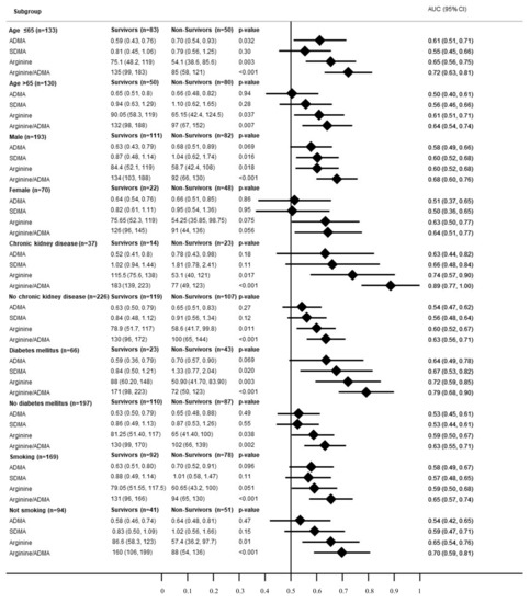 Forest plot for subgroups in regard of the primary endpoint (90-day mortality). Legend: Forest plot for subgroups in regard of the primary endpoint (90-day mortality). Data is presented as area under the curve (AUC) and 95% confidence interval (95%CI). ADMA: asymmetric dimethylarginine; SDMA: symmetric dimethylarginine.