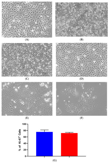 Slides were observed using an Olympus BX51 fluorescence microscope (Shinjuku City, Tokyo, Japan) and photographed with an Olympus DP70 (Shinjuku City, Tokyo, Japan) mounted camera. Cells in culture plates were viewed by phase contrast on an Olympus IX-71 inverted fluorescence microscope and photographed using an Olympus DP70 mounted camera. Proliferation scores were determined based on Ki-67 protein detection, a nuclear protein expressed during several cell cycle phases (G1/S/G2/M), which is frequently employed as an indicator of actively proliferating cells [22]. Proliferation scores (%) were generated by selection of three random images for nuclei counting using Fiji-ImageJ software [23]. The total number of cell nuclei was divided by the total number of Ki-67 (+) nuclei and averaged among three images.