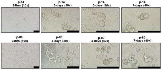 iSGEC-nSS2 early (p-14) and late (p-80) spheroid formation on matrigel. Legend. Cells were initially seeded at 4 × 104 per well. Cultures began to form spheroids at 24 h on matrigel (2 mg/mL). Early passages (e.g., p-14) formed larger, but overall fewer spheroids when assessed after 3 days. Spheroids appeared to reach their final size after 3–4 days. Scale bars represent 200 µm.